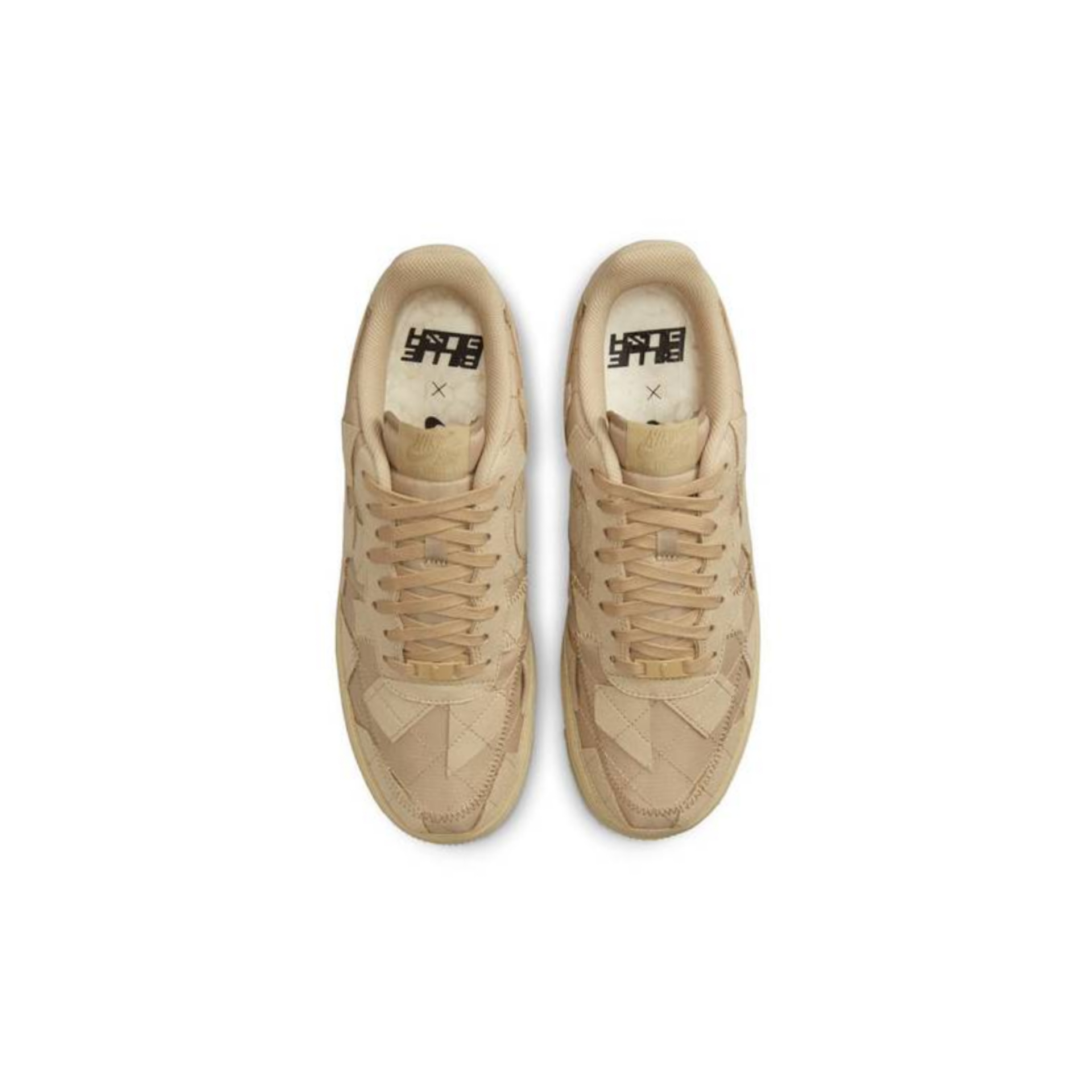 The Billie Eilish x Nike Air Force 1 Low “Mushroom” has a striking quilted-like stitching and geometrical shape overlays on its upper, as well as being constructed with eco-friendly vegan and recycled materials. The soles, laces, and lining are all in harmony with the hues of the upper.