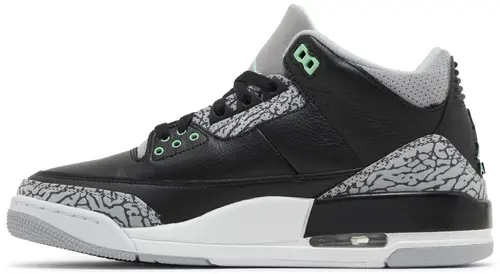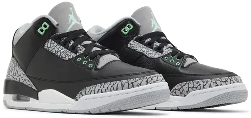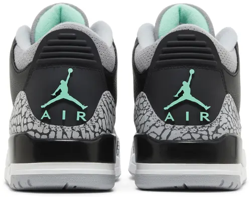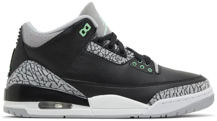 The premium leather upper is complemented by the signature elephant print overlays on the toe and heel, delivering the timeless Jordan 3 aesthetic. The “Green Glow” detailing on the eyelets, Jumpman branding, and the outsole adds a pop of color, giving the shoe a bold yet refined look.