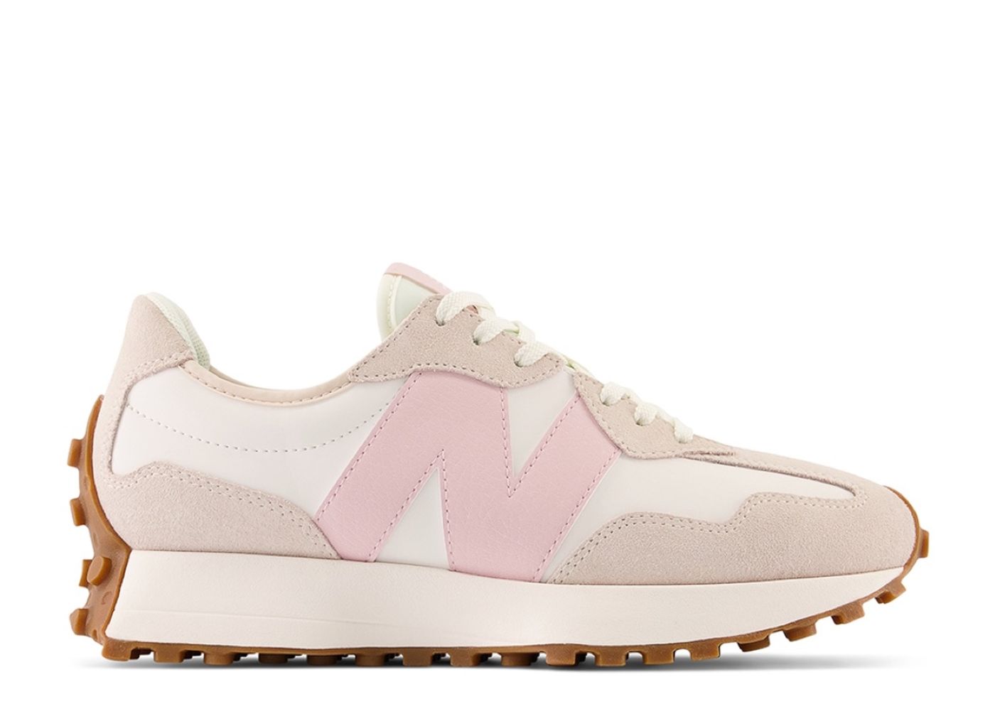 The New Balance 327 ‘Stone Pink’ is a modern reinterpretation of the brand’s classic 1970s running shoes, blending retro aesthetics with contemporary design elements. This women’s sneaker features a combination of suede and mesh materials, offering both durability and breathability. The upper showcases a harmonious mix of soft pink and neutral tones, complemented by an oversized white “N” logo on the lateral side, adding a bold statement to the shoe’s silhouette.