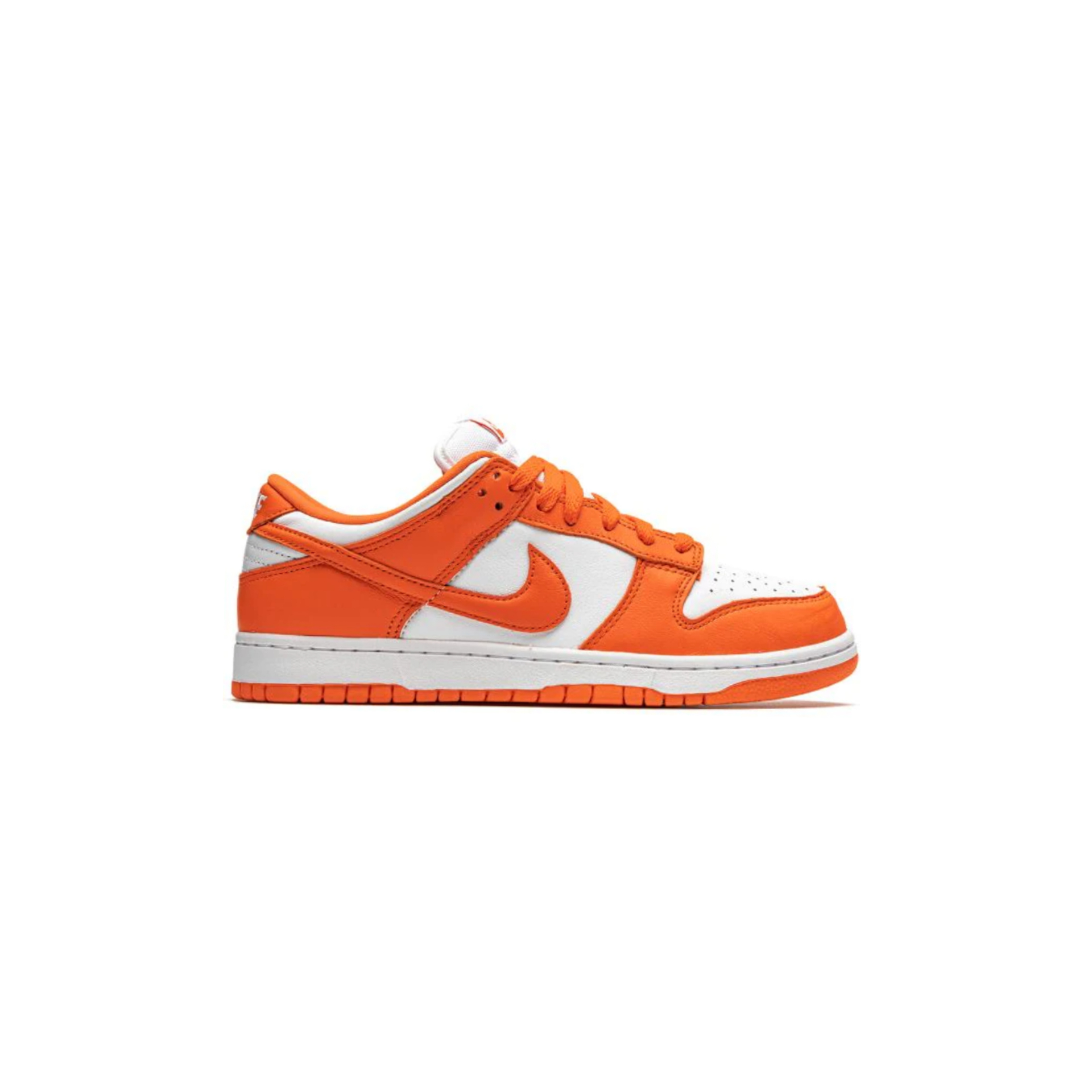 In the Nike Dunk Low Syracuse, a white leather upper takes center stage, while Orange Blaze overlays add a pop of color that extends to the laces, tongue label, and lining. The white midsole and orange outsole create a balanced two-tone design, making it an attention-grabbing yet straightforward Dunk.